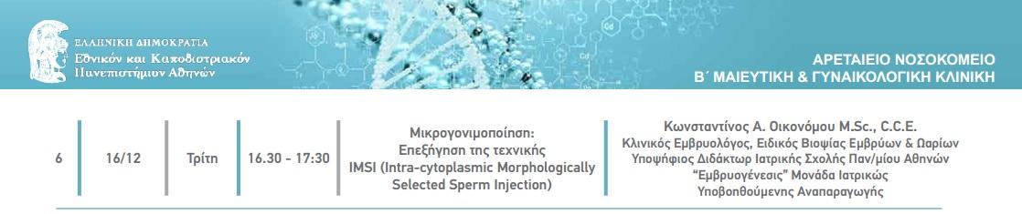 O Εμβρυολόγος Κωνσταντίνος Οικονόμου θα συμμετάσχει ως ομιλητής στα μετεκπαιδευτικά μαθήματα του Τμήματος Υποβοηθούμενης Αναπαραγωγής της Β’ Μαιευτικής και Γυναικολογικής Κλινικής, ΕΚΠΑ στο Αρεταίειο Νοσοκομείο με τίτλο «Εισαγωγή στις Μεθόδους Υποβοηθούμενης Αναπαραγωγής»